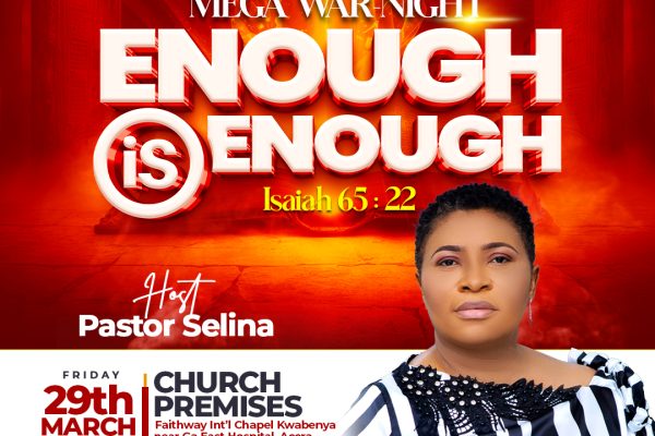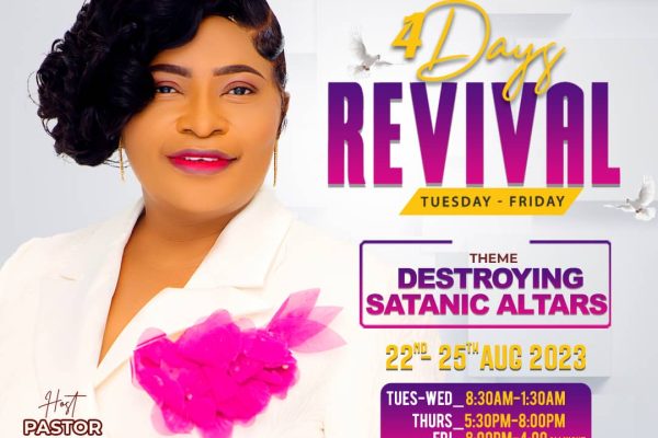 Continue readingThere is going to be a 4 day revival , dubbed “destroying satanic alters” at the Faithway International Chapel auditorium, Kwabenya. Come and meet the woman of God, Pastor Selina